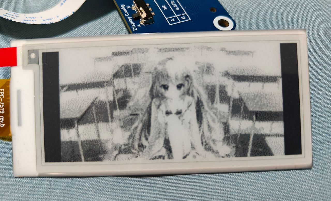 然后在花费了九牛二虎之力后,将抖动出来的图片上传到屏幕驱动上,终于成功将四色灰度图展示到了这块 296x128 的小屏幕上